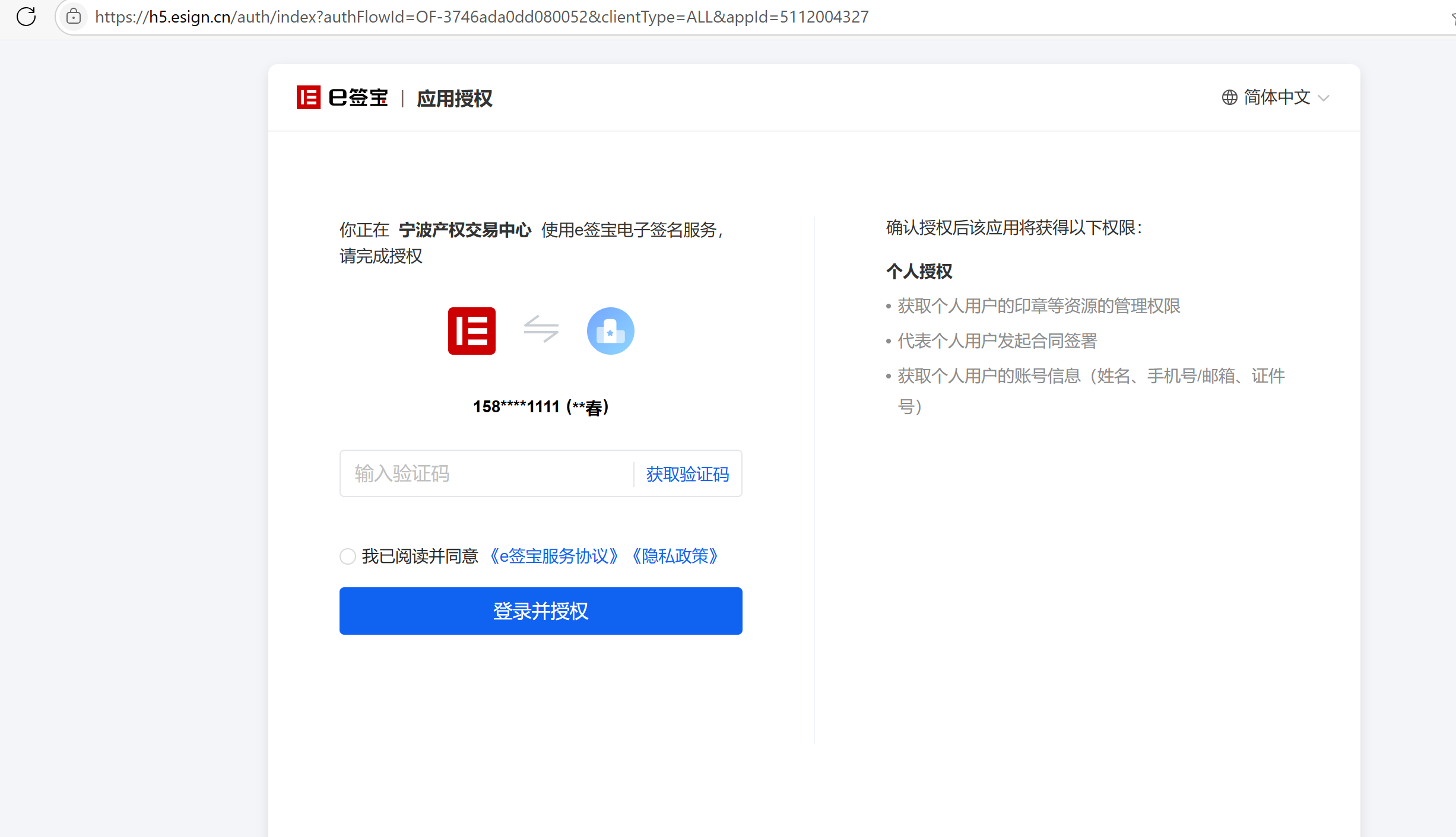 进入企业实名认证页后,需要进行应用授权,获取并输入验证码后,勾选阅读并同意,点击登录并授权提交。