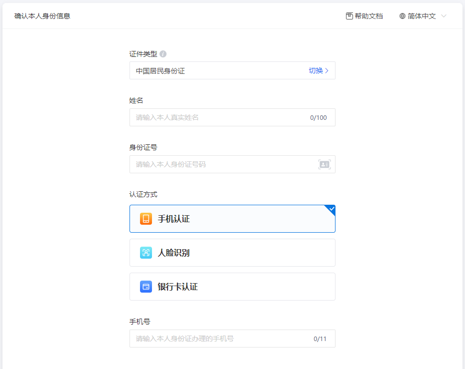 支持手机号认证、人脸识别、银行卡认证三种方式。