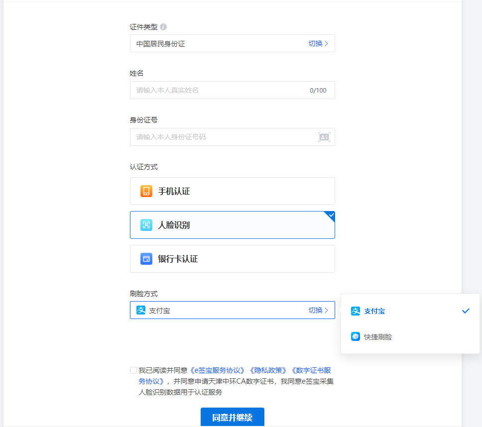 人脸识别:需要输入姓名、身份证号二要素信息。支持快捷刷脸、支付宝两种刷脸方式。