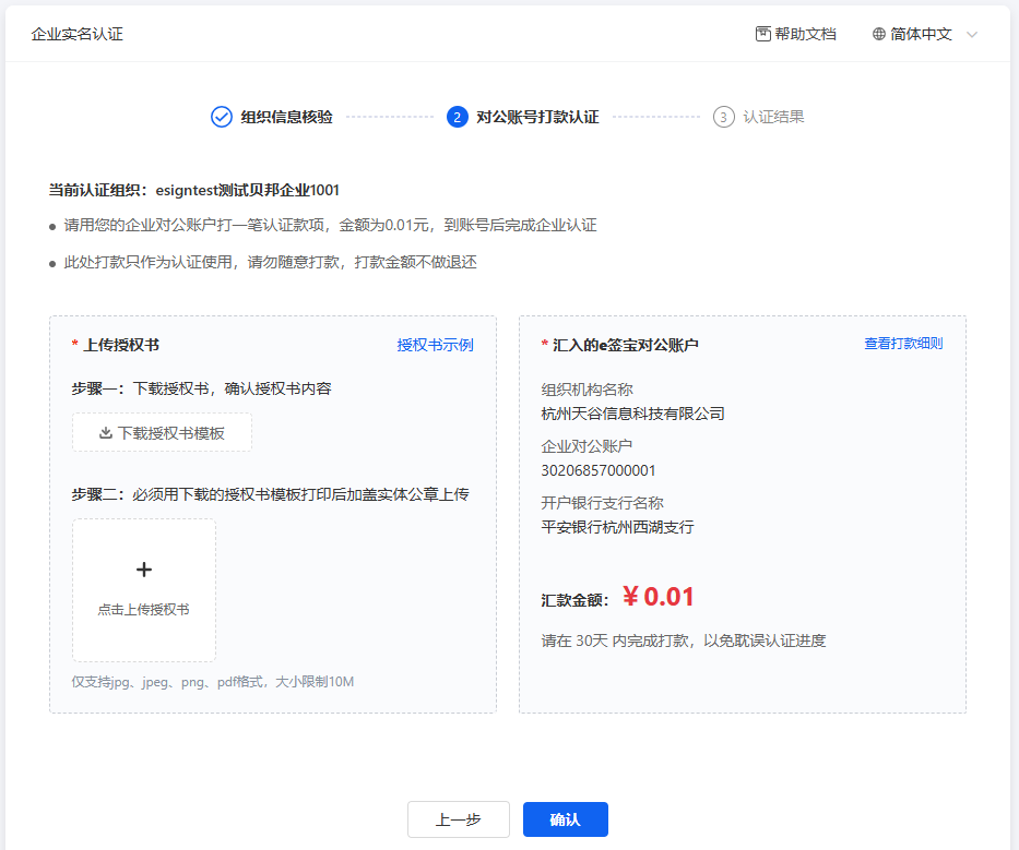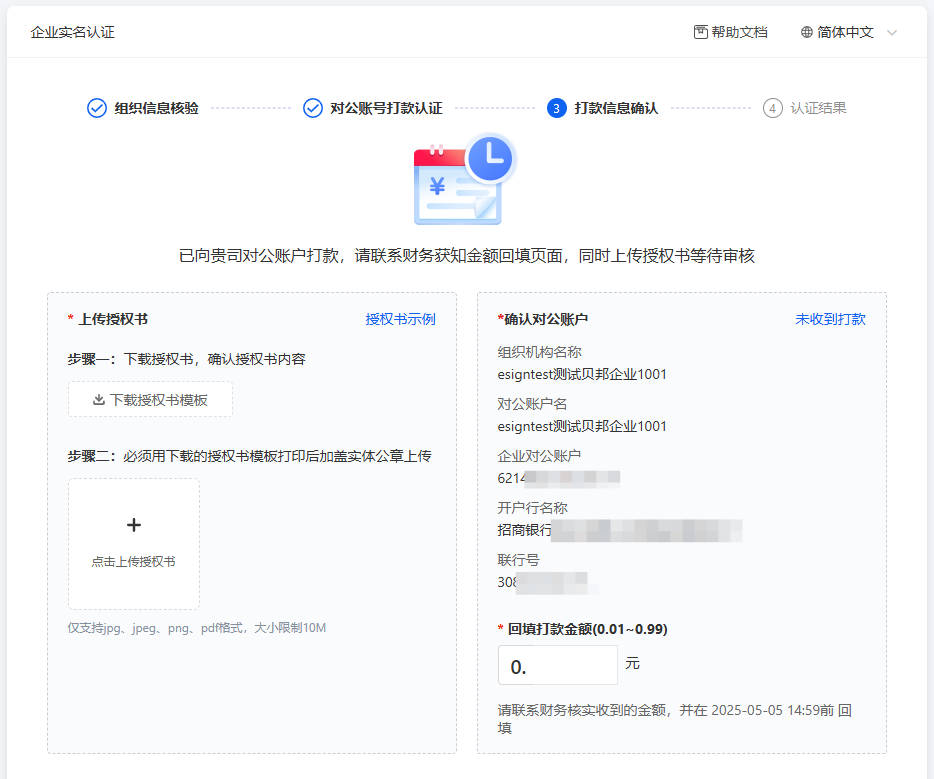 正向打款:e签宝给贵司对公账户上打款1元以下的随机金额。