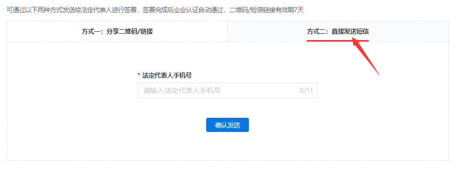 点击页面中【方式二:直接发送短信】,输入法人的手机号,给法人发送短信签署链接,法人收到签署短信后,点击签署链接完成授权签署即可。