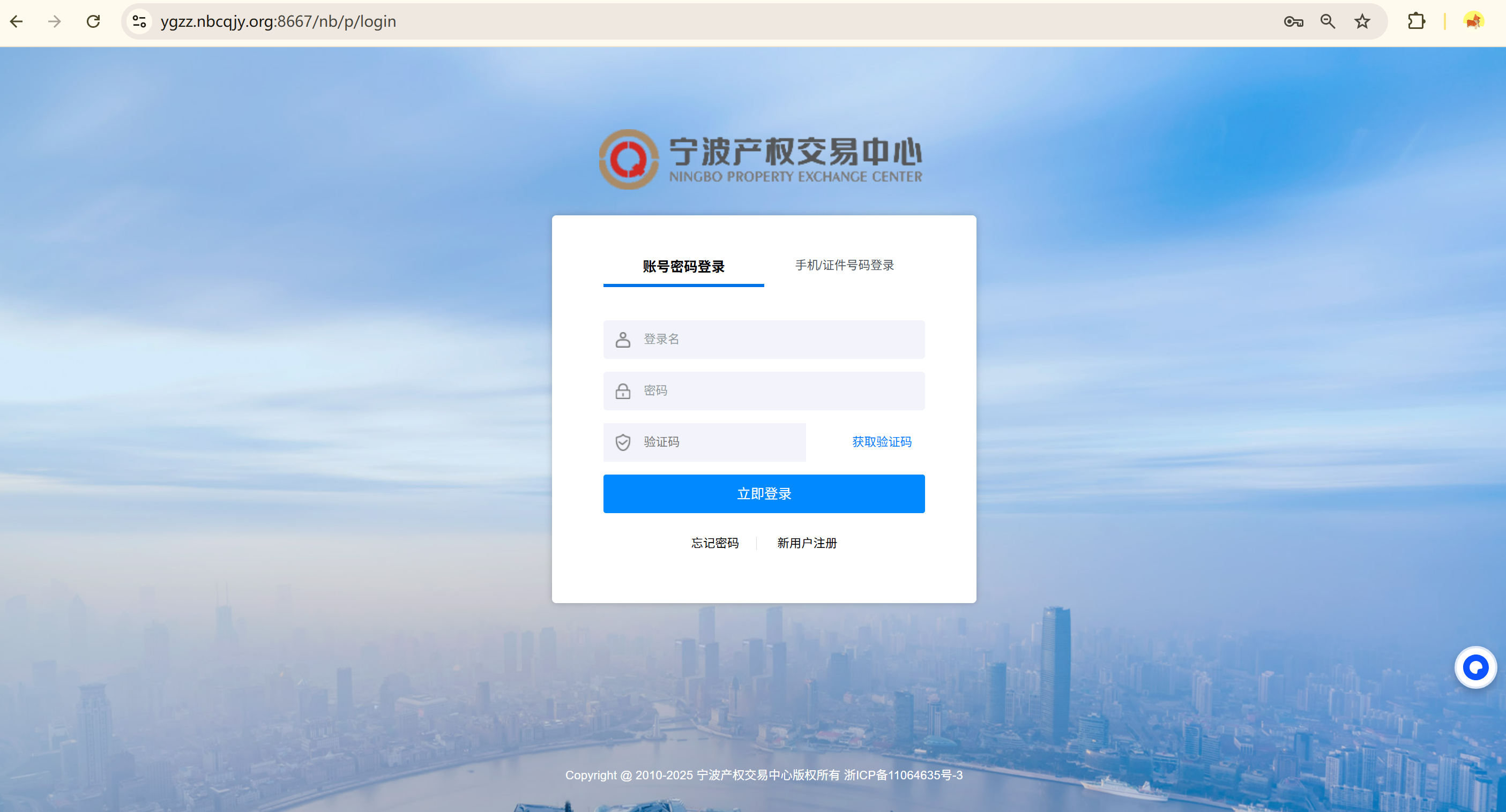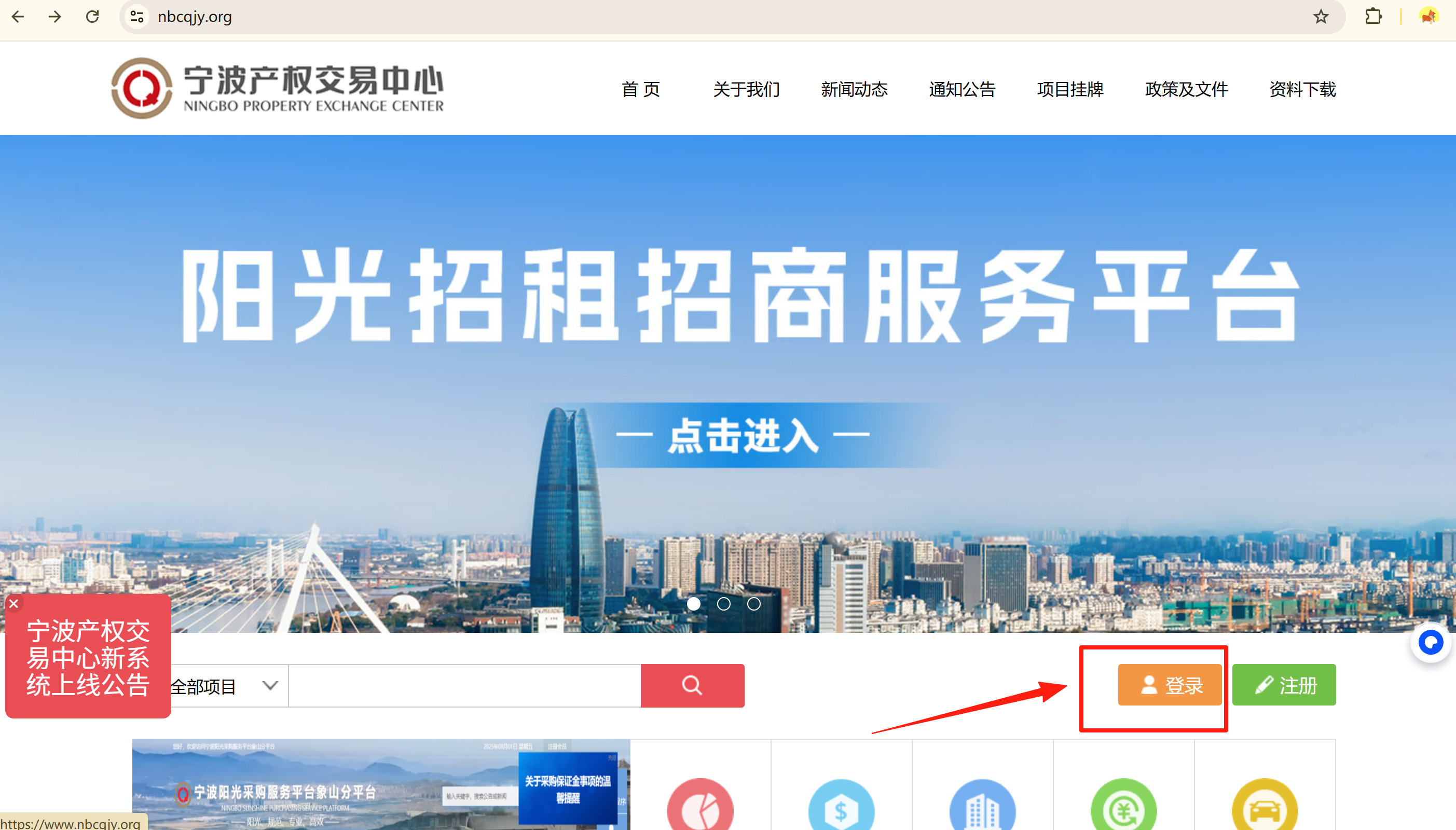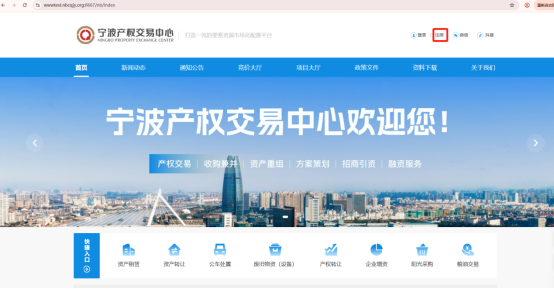 1)委托方访问宁波产权交易中心官网,点击右上角的“登录”按钮,进入登录页面,如下图所示: