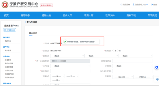 新注册的委托方用户,在首次使用委托方身份登录时,进入用户中心后,系统会提示需要完善委托方信息,按要求选择隶属关系,补充企业信息、法人信息、监管信息(非必填,代理不需要填写),上传营业执照等附件材料后提交交易机构审核。