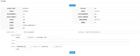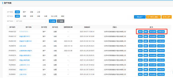 填写资产信息后保存,资产列表中将产生一条新的资产。可以对资产进行查询、修改、删除、状态变更、查看交易记录等操作。