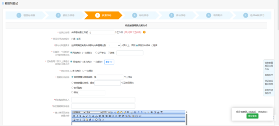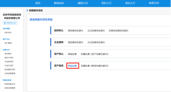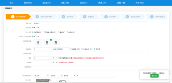 委托方进入用户中心后,点击“项目委托”,选择要委托的项目类型(资产租赁-单独处置),进入项目登记界面,如下图所示:
