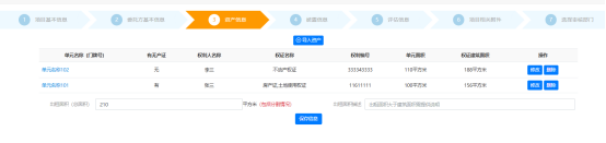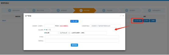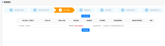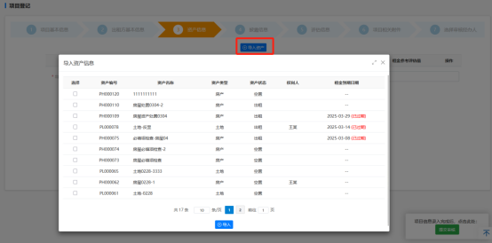 标的添加完毕后,可添加资产信息。点击“资产信息”后,导入列表中展示本企业下的资产,勾选一个资产后,点击导入按钮导入资产信息,导入成功后补充资产信息后保存资产信息。