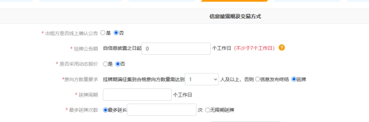 延牌设置:挂牌期满后征集到符合条件的意向方未达到要求时,选择延牌时可设置延牌规则、延牌周期、最多延牌次数