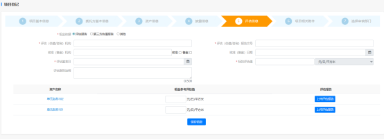录入评估信息后,可对资产分别填写租金参考评估值,并上传评估报告,默认可以缺省。但若上传了评估报告,则租金参考评估值需要必填。