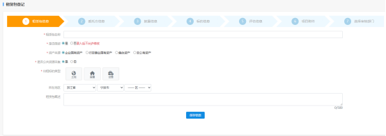 (1)项目基本信息页面:选择出租标的类型,按要求填写出租项目基本信息(带*号的是必填项),租期与租期截止日可选择一项填写。填写完成后点击【保存信息】,点击②委托方基本信息进入委托方基本信息录入页面。