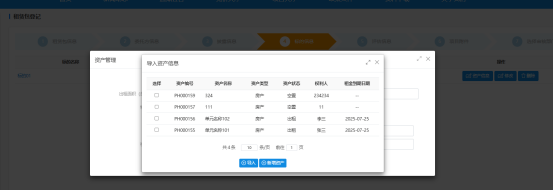 点击“导入资产”后,导入列表中展示本企业下的资产,勾选一个或多个资产后,点击导入按钮导入资产信息,导入成功后会在列表中展示,系统会自动累计出租面积。