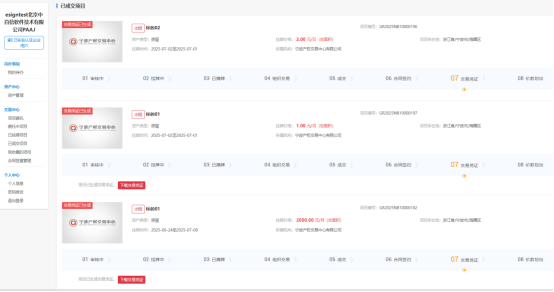 已成交项目列表中展示已成交的委托项目,可以跟踪后续成交签约和结算事项。包括合同签约、交易凭证、价款划出等。