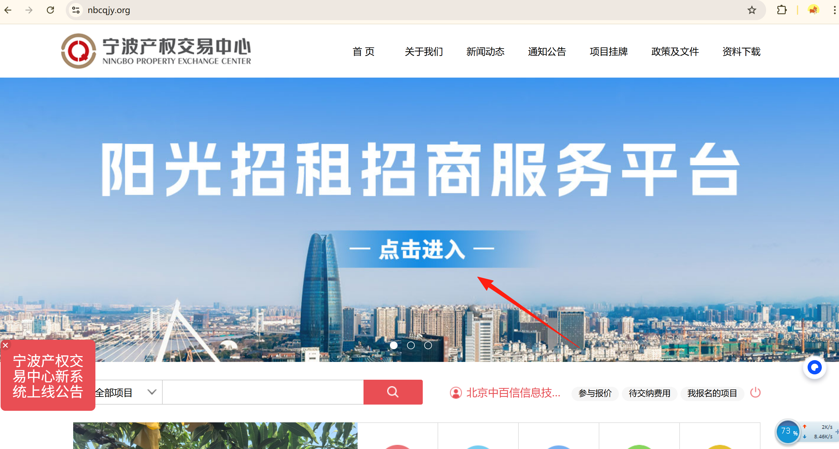 2)登录成功后,会重新跳转到网站首页,点击首页“阳光招商招租服务平台”进入新平台,如下图所示: